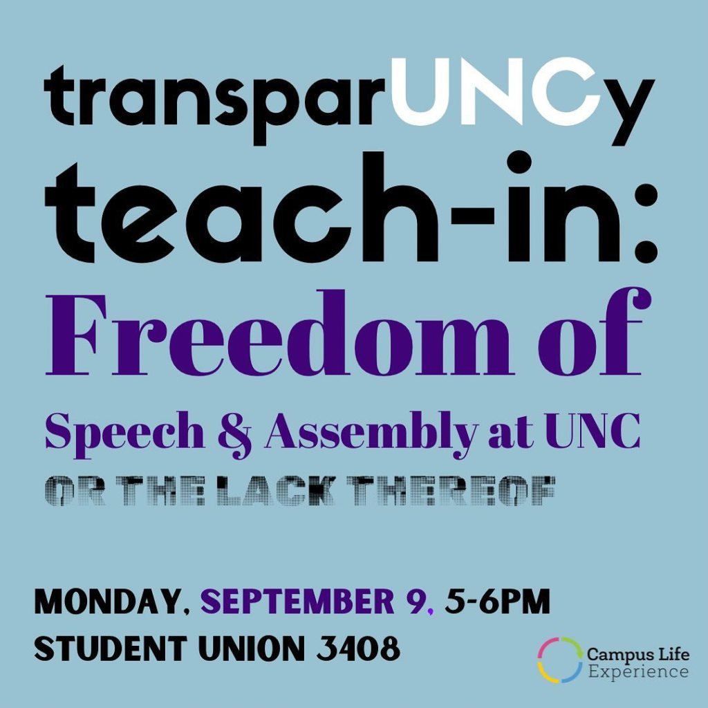 TransparUNCy is hosting a teach-in on the current state of freedom of speech and assembly at UNC TODAY from 5-6pm.