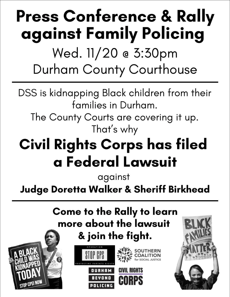 The rally is in support of a Civil Rights Corps’ (CRC) lawsuit filed Nov. 13, 2024, against Durham County District Court Judge Doretta Walker for her repeated and ongoing refusal to permit community members and the public to observe judicial proceedings relating to one of the most profound exercises of state power — the forcible separation of children from their parents. The complaint alleges Judge Walker violated CRC’s First Amendment rights. CRC also sued Sheriff Clarence F. Birkhead for enforcing the unconstitutional orders.