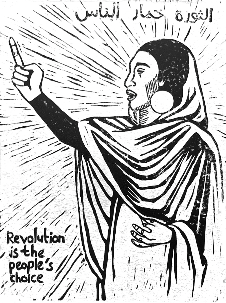 linocut print created for “Trajectories: Liberated Pathways through Makeup, Photography, and Jewelry,” an exhibition by Maya Ghanem & Nashia Ogbuagu at @queen_street_magic_boat. all proceeds from art goes to sudanese, palestinian, and congolese organizations.