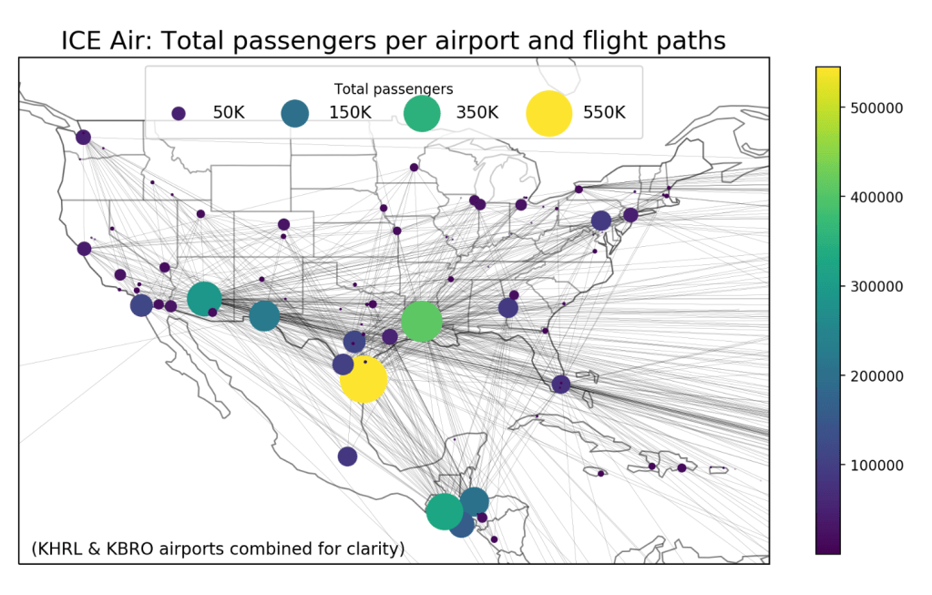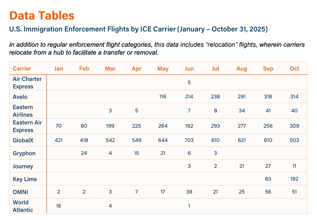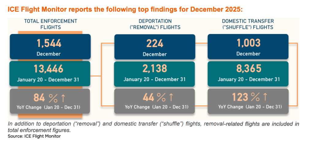 ICE Flight Monitor (https://humanrightsfirst.org/ice-flight-monitor/): “Using publicly available aviation data, the project monitors and analyzes: ICE deportation flights, domestic transfers between detention centers, military flights used for immigration enforcement, flights to offshore detention in Guantanamo, Mexican and Panamanian government deportation flights. This data reveals the scale, mechanics, and international reach of the US immigration enforcement system.”